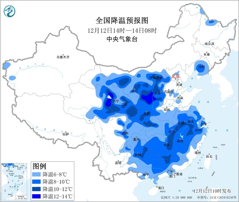 中央气象台12月12日10时发布暴雪蓝色预警:预计12月12日14时至12月13日14时,山西西部和北部、山东西南部、河南中东部和南部、安徽北部、江苏西北部等地部分地区有大雪,其中,山西西部、河南中部等地局地有暴雪(10-12毫米)。上述部分地区新增积雪深度5~8厘米,局地可达10-15厘米以上。