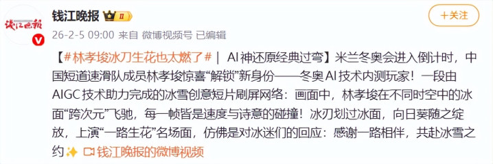 2月5日,钱江晚报晒出林孝埈参与拍摄的AIGC冰雪创意短片。